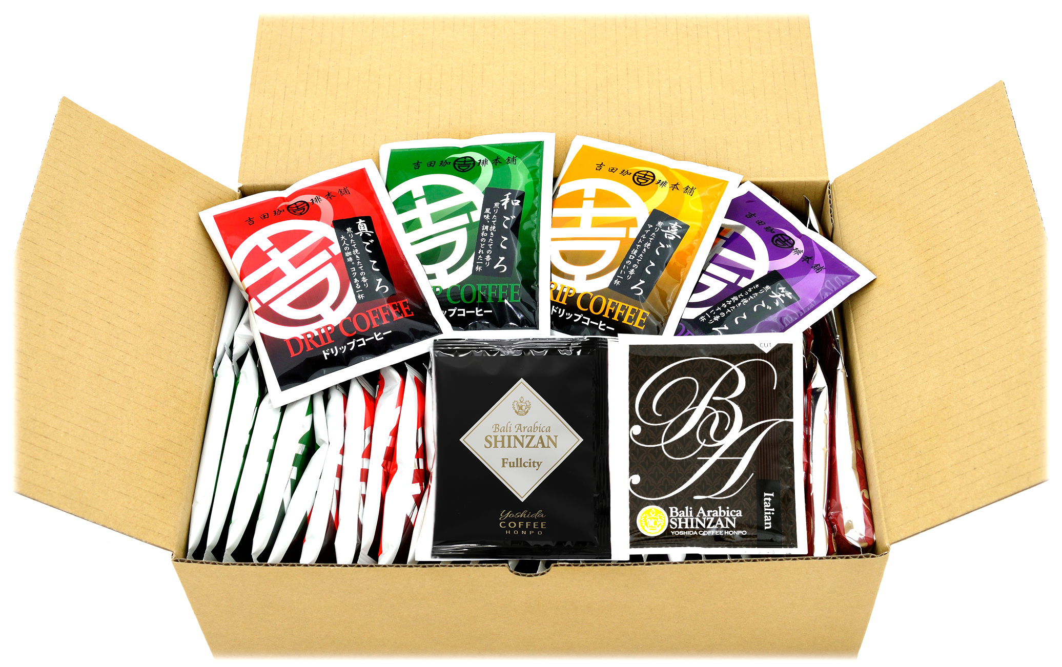 バリ・アラビカ神山フルシティ(中深煎り)とイタリアン(深煎り)のドリップコーヒーが入ったよくばりなセットバリ・アラビカ神山イタリアンはアイスコーヒーにも最適! いろんなテイストが楽しめる60杯分でこの価格。